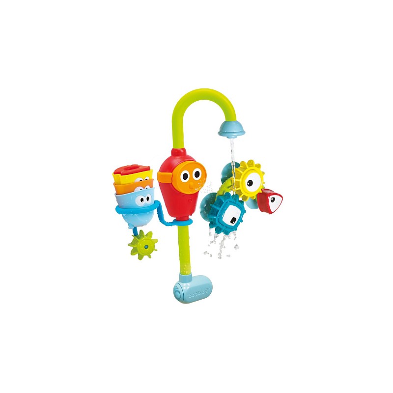 Copiii pot pompa apa din gura pompei. Roțile dințate colorate sunt, de asemenea, atașate de cadă sau de perete, unde se rotesc atunci când copiii toarnă apă peste ele.