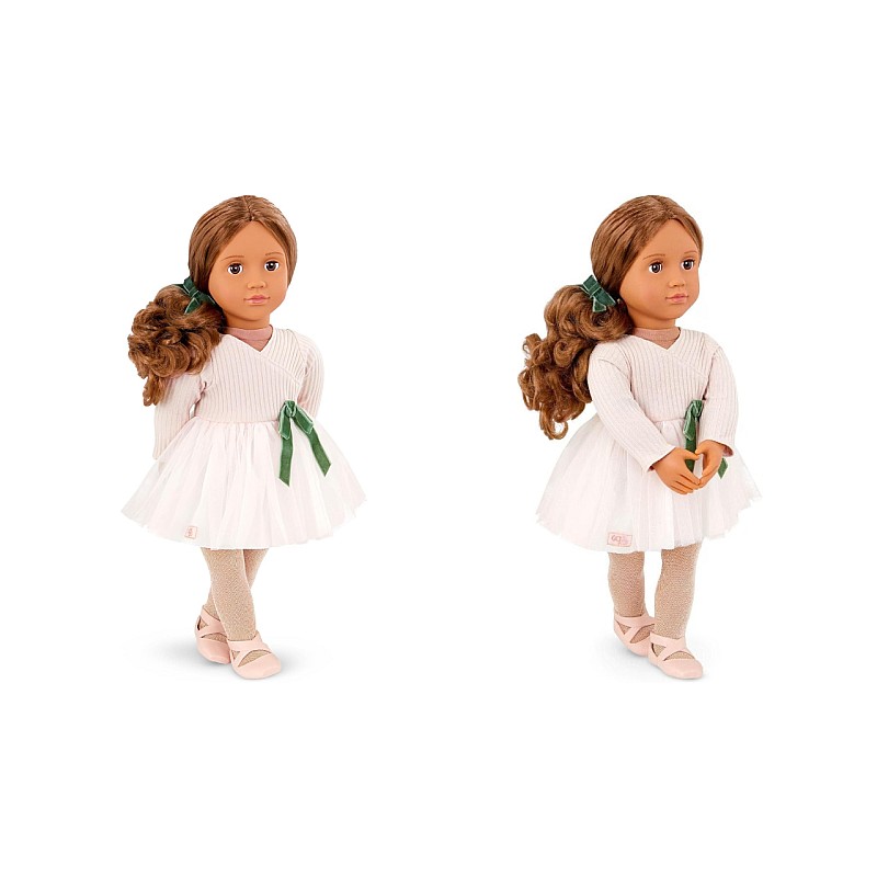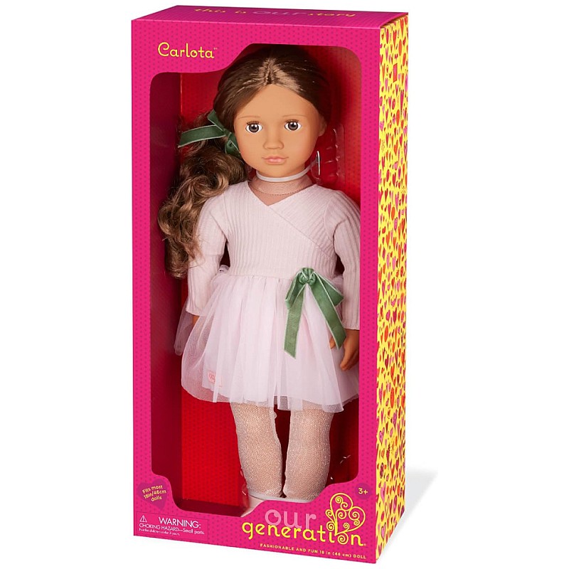 Carlota, păpușa balerină Our Generation, este aici pentru a inspira tinerii dansatori cu trăsăturile sale realiste, inclusiv frumoșii ochi căprui care se deschid și se închid și părul lung ondulat brunet, perfect pentru coafare înainte de fiecare recital.