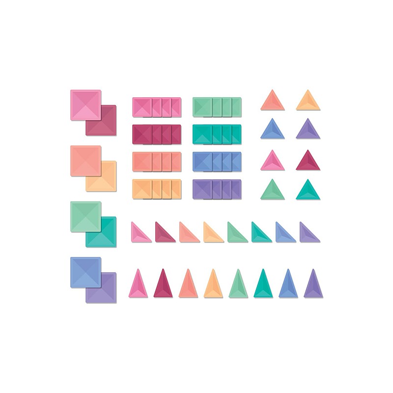Dispunând de o varietate de pătrate mici și mari, precum și de triunghiuri echilaterale, isoscele și dreptunghiulare în culori pastelate.