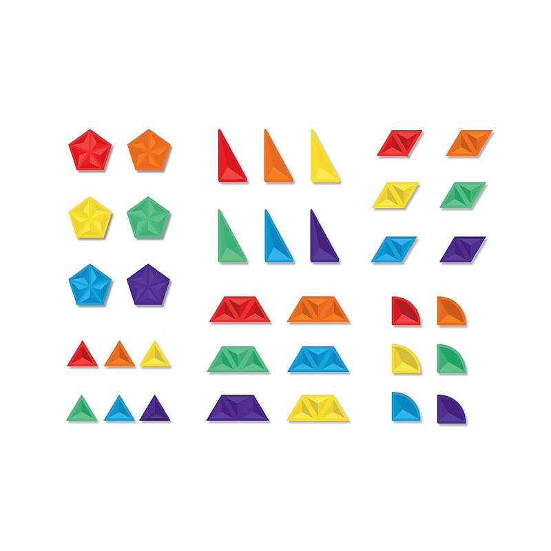 Setul conține: 6 poligoane, 6 unghiuri drepte mari, 6 triunghiuri echilaterale mari, 6 romburi, 6 trapeze, 6 sferturi de cerc, 1 broșură cu idei si o pungă de depozitare.