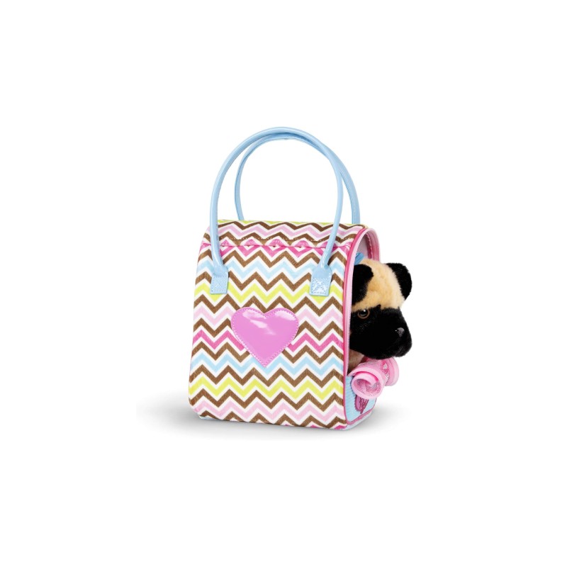 În geanta practică cu model în zigzag, îți poți lua cu ușurință prietenul de pluș la plimbare - pur și simplu deschide fermoarul din față și pune-l înăuntru.