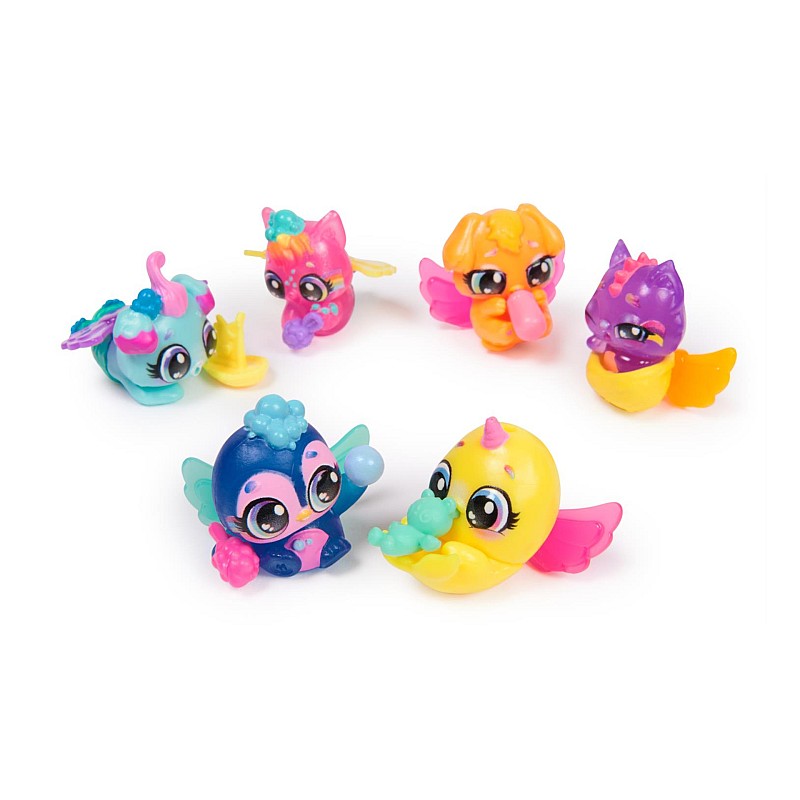 Fiecare personaj vine în 1 din cele 6 culori neon și este pozat jucăuș, gata să stea în Gloasis Hatchimals!