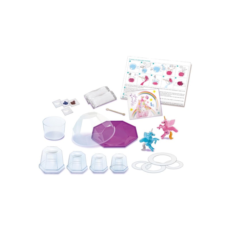 Kitul 4M Magical Unicorn Crystal Terrarium conține: 2 figurine cu unicorni, 1 autocolant colorat, 2 compuși pentru cristale albe, 3 coloranți, 1 compus alb pentru însămânțare.
