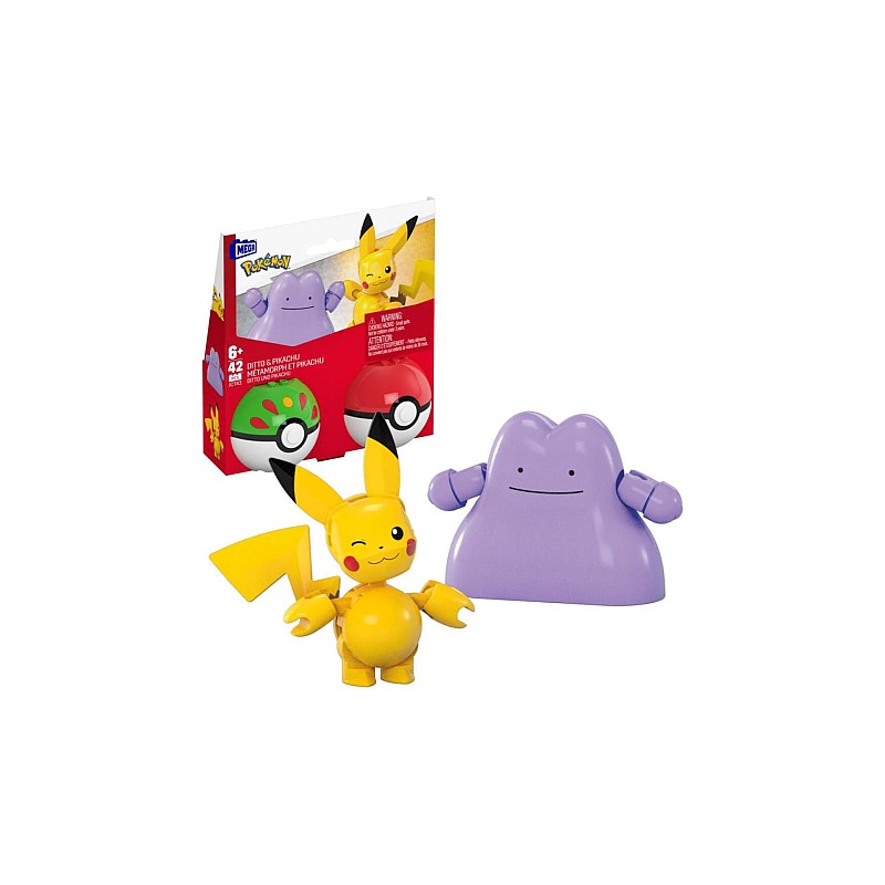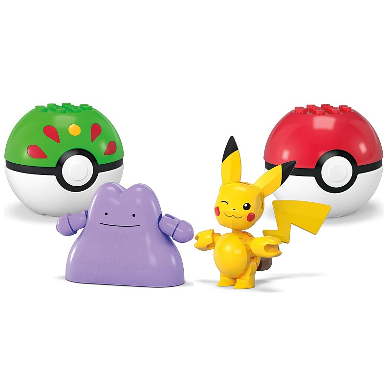 Set Poké Ball cu 2 Pokémon construibili și 2 mingi Poké, prezintă popularii Pokémon Pikachu și Ditto.