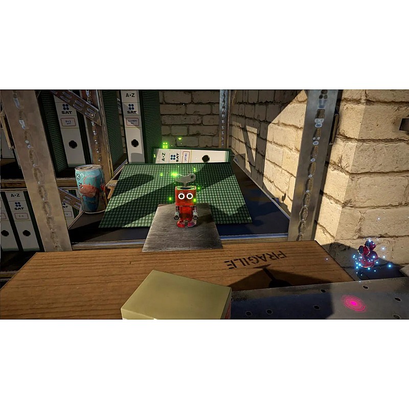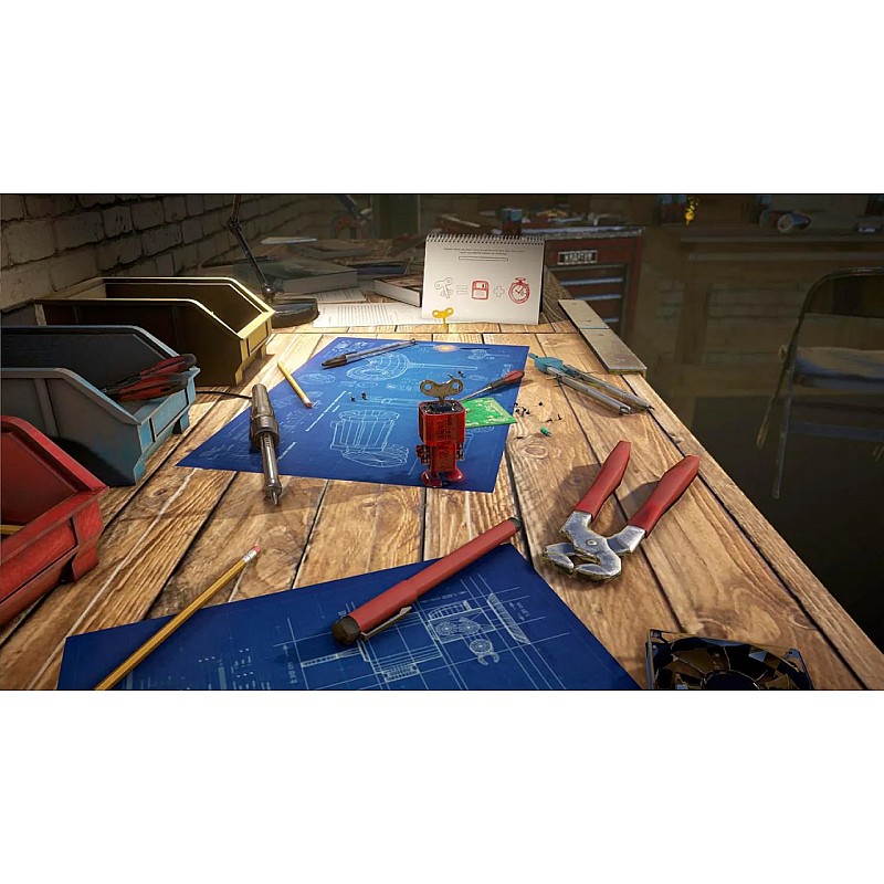 - Îndrăznește să pilotezi A-RED, mergând pe pământ sau în aer cu jetpack-ul său, pentru a descoperi toate surprizele ascunse în atelierul gigantic și haotic!