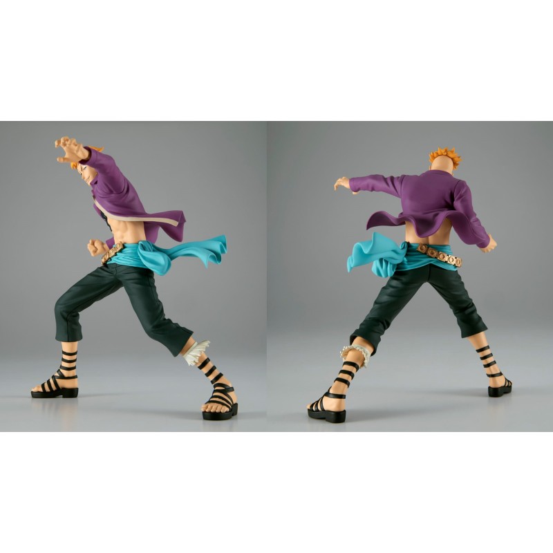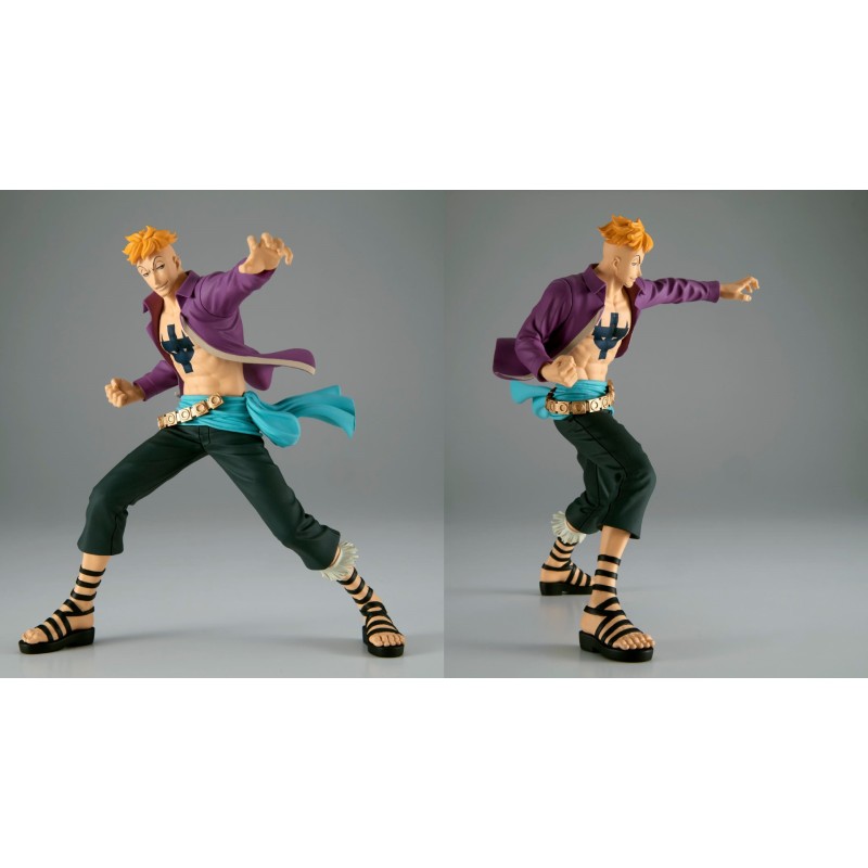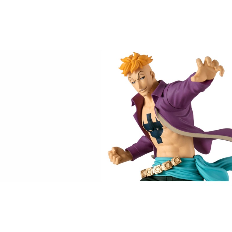 Îmbrăcat în cămașa sa iconică violetă deschisă, care îi dezvăluie toracele tatuat, și pantaloni negri cu o centură decorată cu detalii aurii, Marco este reprezentat cu mare fidelitate față de detaliile manga-ului.