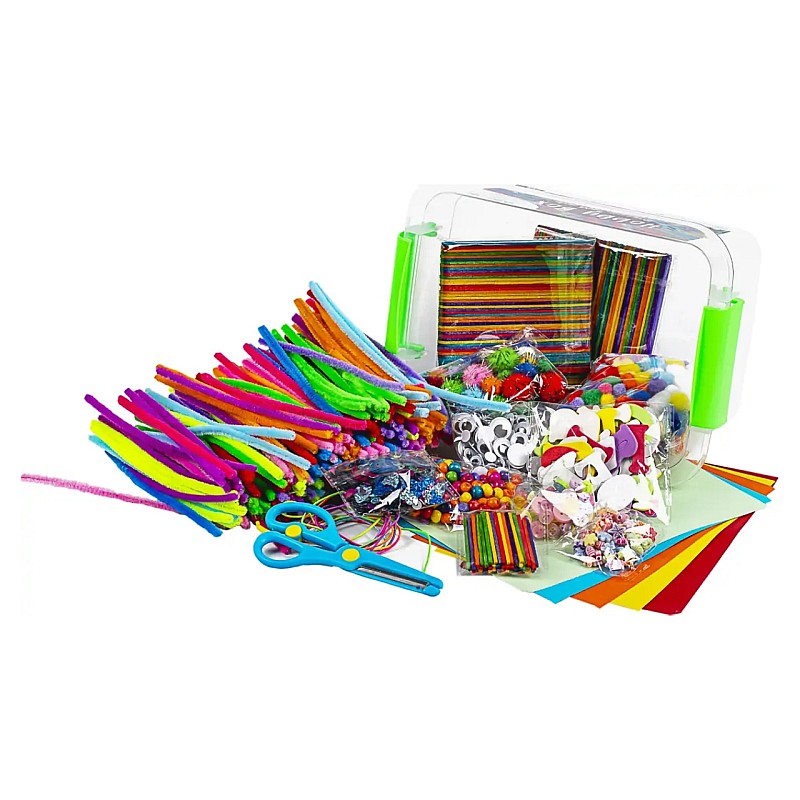 Valiza conține: Foarfece, chenille în mai multe culori, bețișoare de înghețată colorate, pompoane în mai multe nuanțe și culori, mărgele în diferite materiale și nuanțe, nasturi, ochi mobili, chibrituri colorate, confetti, litere din cauciuc spumat, carton și ață elastică.