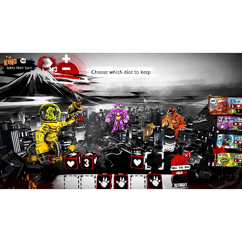 Aruncă zarurile și găsește cele mai bune combinații posibile pentru a domina Tokyo, indiferent dacă alegi să te vindeci, să ataci, să cumperi cărți sau să câștigi puncte de victorie.